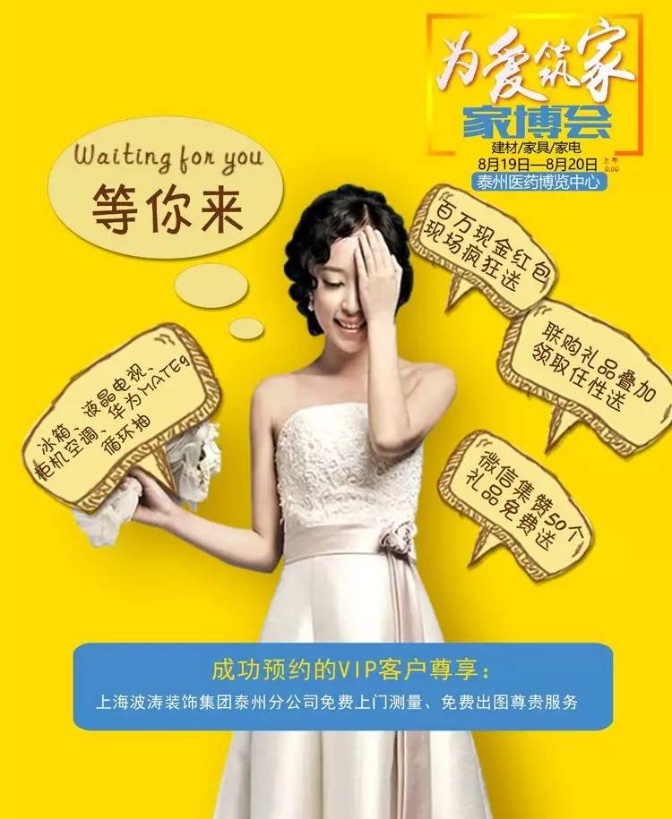 越有本领的汉子,大整点抽不断!为泰州拆求学从打制一场《为爱建家》的超等平台。实惠抵家!勾当当天凭VIP邀请函参加签到即可领取:80~800元现金红包一个大抽券两张 什么?还不敷简单? 那就前两百名再额外赠送一份精彩礼物!实力降价,Ⅳ.2017新款钜惠!!首届《为爱建家》广电家博会正式启动!